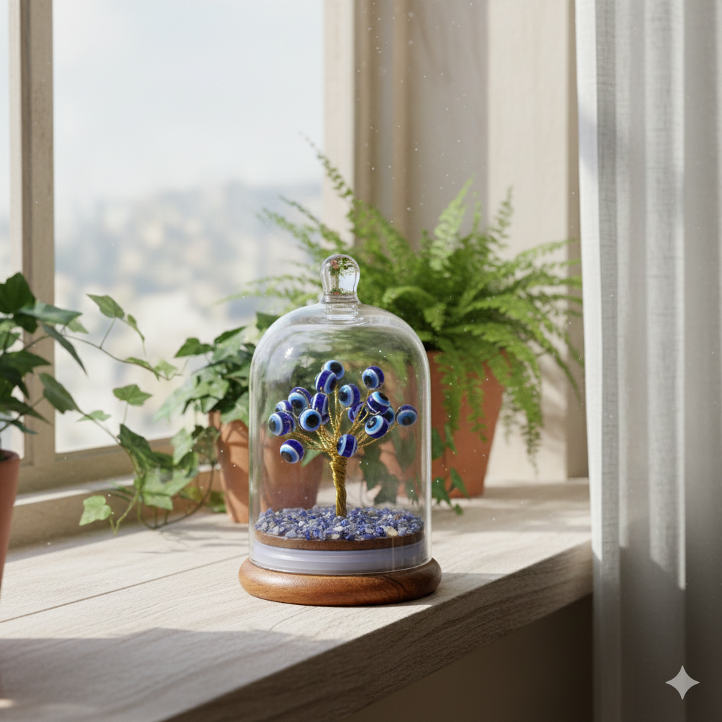 The Evil Eye Dome Tree helps protect you from negative energy and the evil eye. It is known for bringing protection, healing, and inner strength. This tree supports calmness, clear thinking, and attracts good luck.